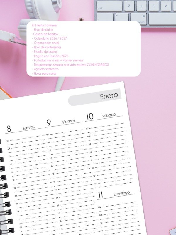 - Hoja de datos -Control de hábitos - Calendario 2026 / 2027 - Organizador anual - Hoja de contraseñas - Planilla de gastos - Página con feriados 2026 - Portadas mes a mes + Planner mensual - Diagramación semana a la vista vertical CON HORARIOS - Agenda telefónica